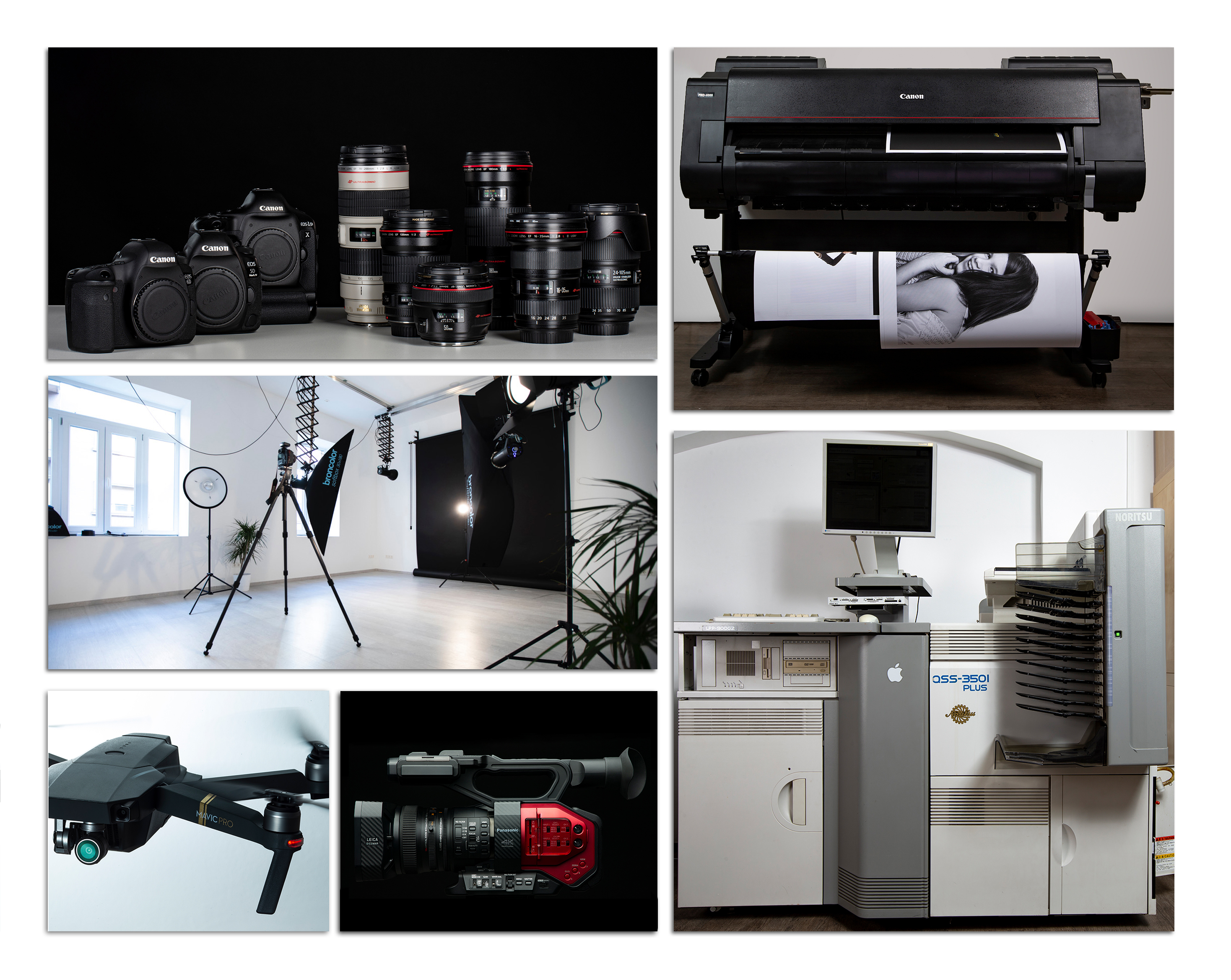 Nagyon büszkék vagyunk folyamatosan fejlődő és bővülő eszközparkunkra. Tükörreflexes fényképezőgépeinkkel (Canon 1DX, Canon 5D Mark IV, Canon 6D Mark II) és Canon objektívekkel készítjük a képeket és a videókliphez szükséges rövid snitteket. A videó díszítéséhez kézi gimball kamerával (DJI Osmo) valamint drónnal (DJI Mavic Pro, DJI Inspire) is szoktunk feltételeket készíteni. Az események nagy totálban történő rögzítéséhez 4K-s Panasonic kamerávalrendelkezünk. Amennyiben szükséges a kreatív fotózások során Broncolor műtermi lámpáinkkalvilágítunk.